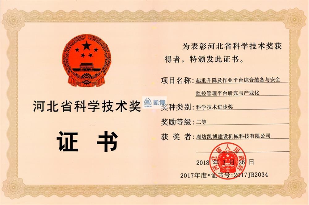 河北省科學(xué)技術(shù)獎二等獎 起重升降及作業(yè)平臺綜合裝備與安全監(jiān)控管理平臺研究與產(chǎn)業(yè)化