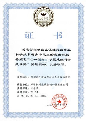 華夏建設(shè)科學(xué)技術(shù)獎 住宅排氣道成型技術(shù)及設(shè)備的研發(fā)