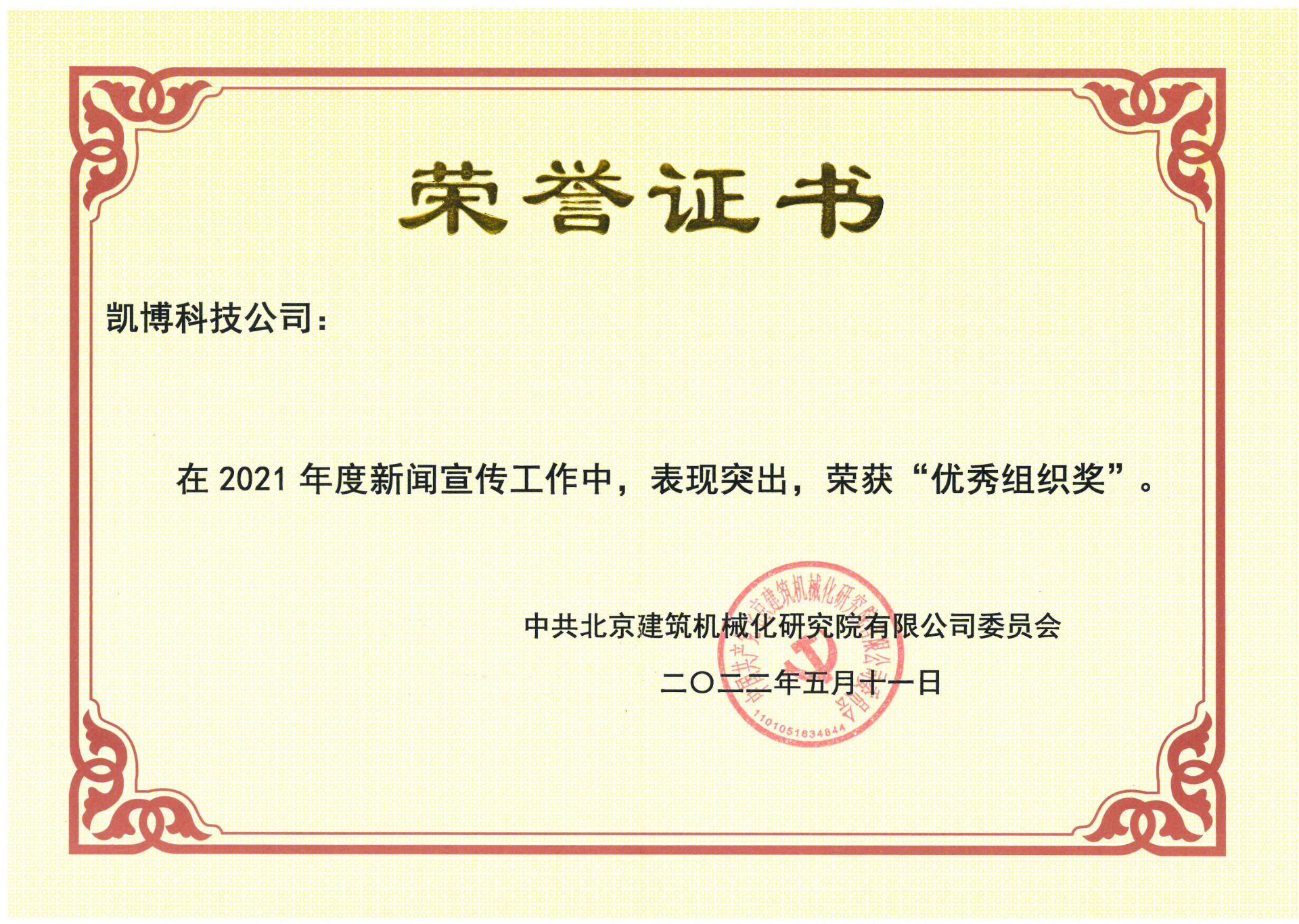 近日,廊坊凱博建設(shè)機(jī)械科技有限公司(以下簡稱“凱博科技”)榮獲北京建筑機(jī)械化研究院有限公司“新聞宣傳優(yōu)秀組織獎”。
