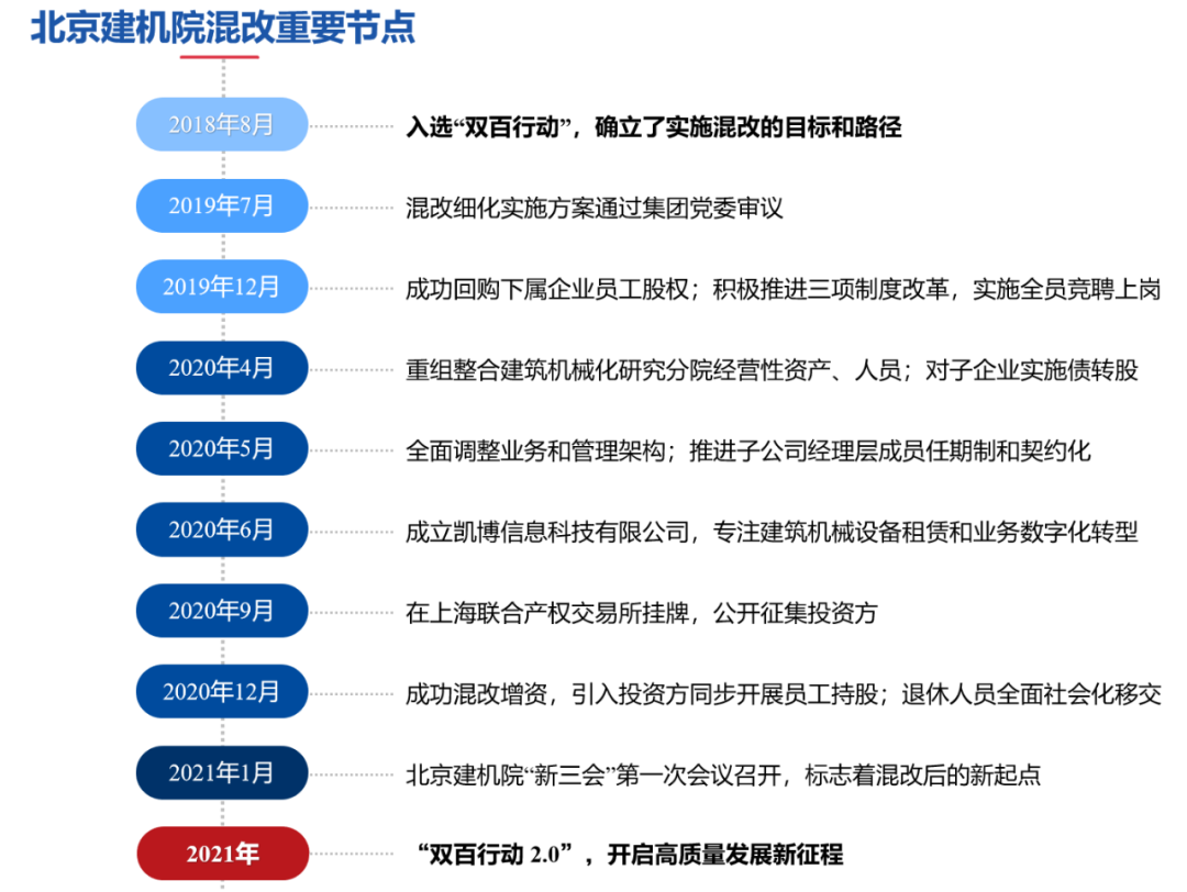 2021年1月18日,北京建機(jī)院與4家投資方和員工持股平臺(tái)簽署《增資擴(kuò)股協(xié)議》,標(biāo)志著中國建研院唯一一家“雙百企業(yè)”混合所有制改革成功落地,也標(biāo)志著中國建研院深化國企改革工作取得又一重大成果。